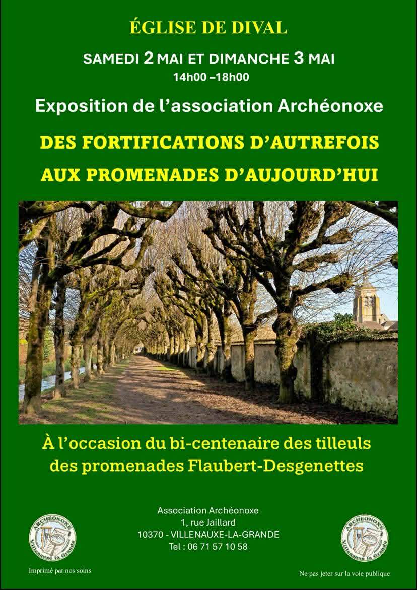 Dans le cadre de la fête de Dival, l’association Archéonoxe propose une exposition intitulée : « Des fortifications d’autrefois aux promenades d’aujourd’hui » Cette exposition met à l’honneur l’histoire locale, en particulier celle des anciennes fortifications de Villenauxe, dont les actuelles promenades suivent encore le tracé. 🌿 Un focus particulier est consacré aux tilleuls des promenades Flaubert-Desgenettes, plantés en 1826 le long de la rue de Presle, qui célèbrent cette année leur bicentenaire. Véritables témoins du passé, ces arbres emblématiques occupent une place centrale dans cette rétrospective.
