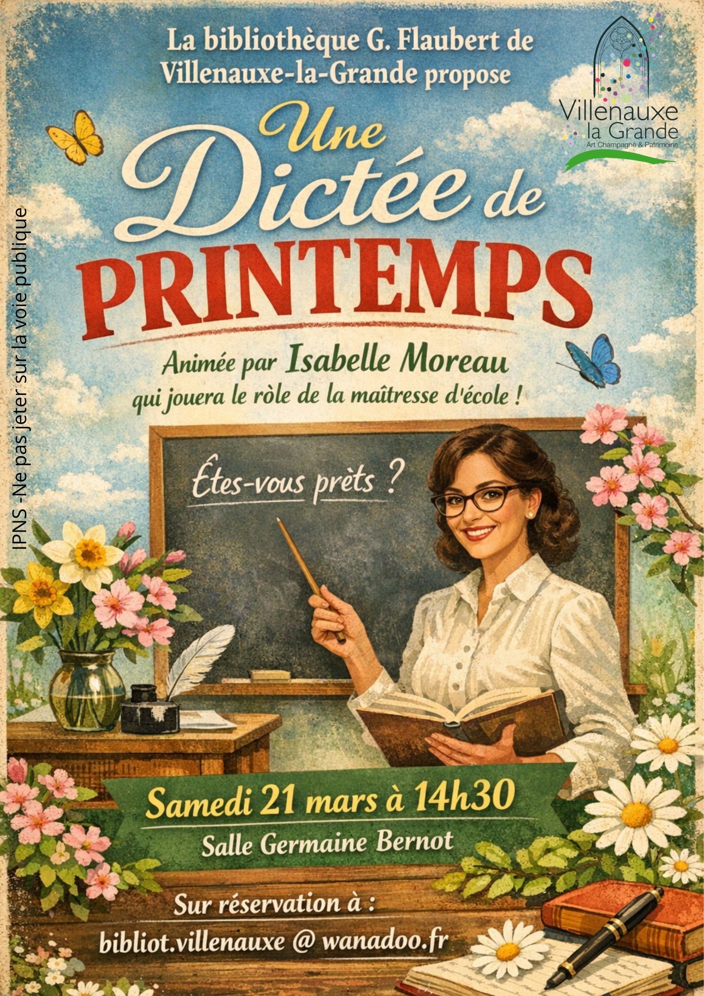 Le printemps arrive tout doucement ! L’occasion de noter dans vos agendas » La dictée de printemps » avec cette année Isabelle Moreau qui endossera le rôle de la maîtresse
